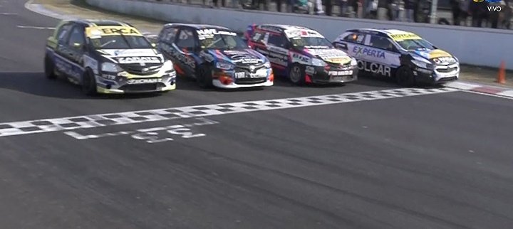 Sin embargo, en ese momento llegó a esa parte pegado a los tres de adelante: Thiago Martínez (Toyota Etios); Joaquín Cafaro, (Renault Clio) y Germán Todino (Toyota Etios). Mientras los dos primeros se tocaban entre sí, el piloto de 35 años aprovechó para pasar por afuera y llegó a la recta emparejado con los demás, a los que les ganó milimétricamente.