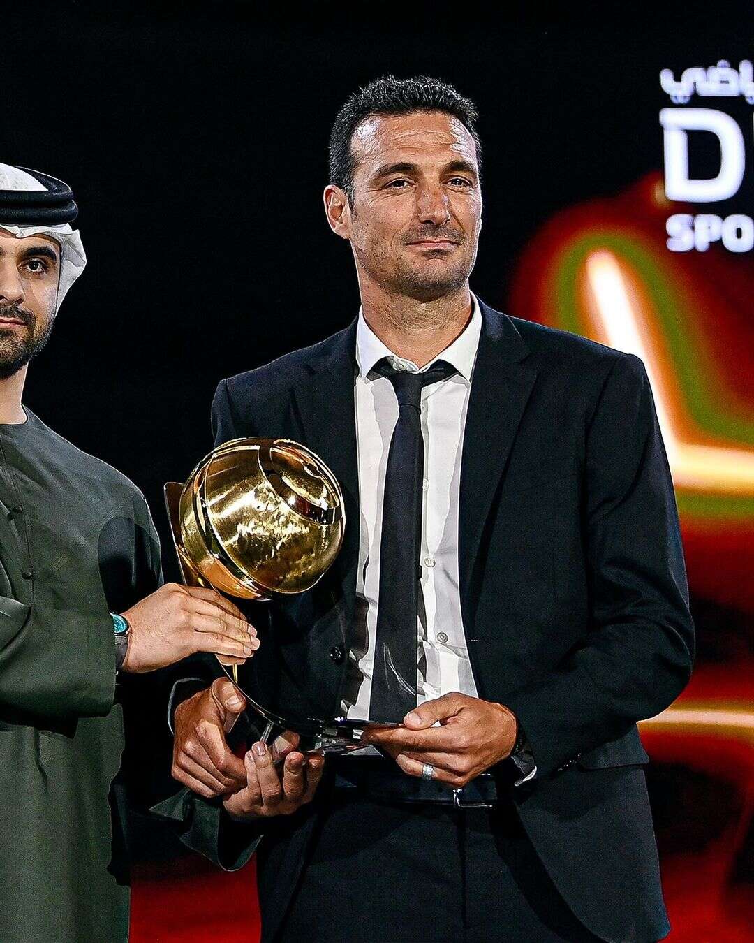 Lionel Scaloni, entrenador campeón del mundo con Argentina en el Mundial de Qatar 2022, recibió el premio a la trayectoria de entrenador en los Dubai Globe Soccer Awards.