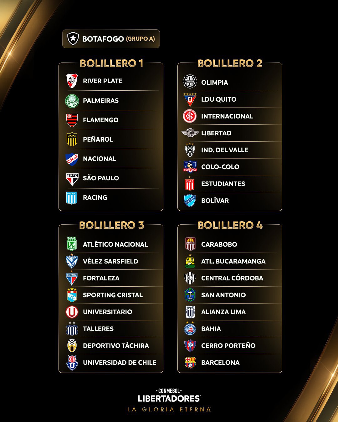 - Luego seguirá el bolillero 2 y los clubes que salgan sorteados irán, por orden de aparición posición, completando los grupos del A al H respectivamente.