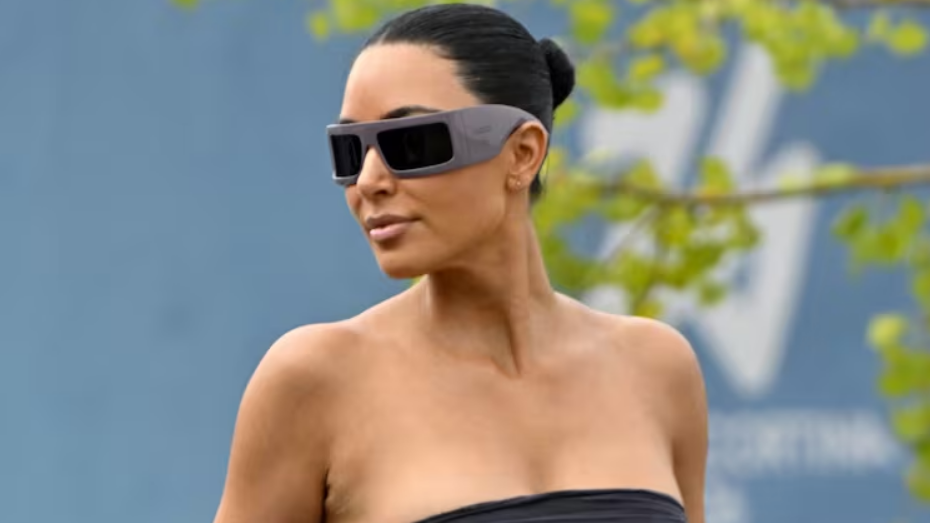 Kim lució un conjunto de top bandeau negro y falda larga ajustada de Balenciaga, que complementó con un buzo con cierre al tono, botas de reptil con taco aguja y anteojos de sol envolventes.