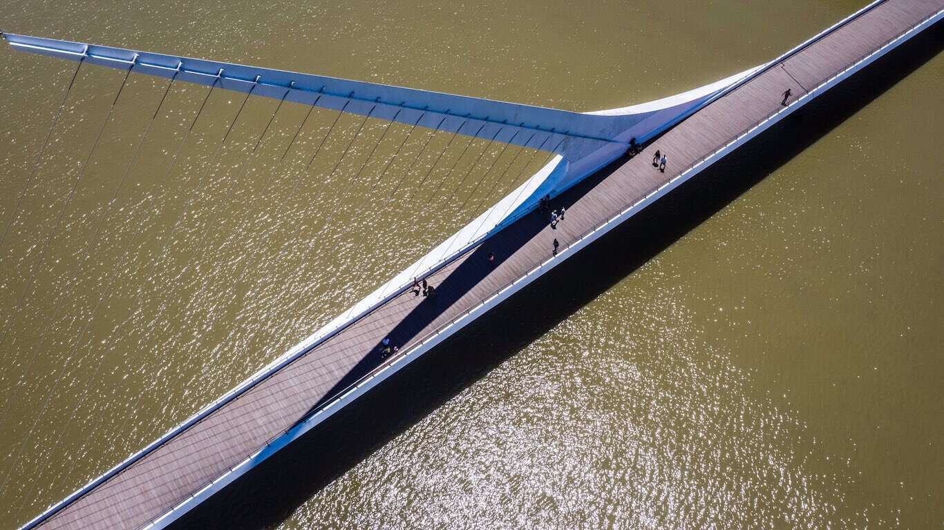 La obra tiene una particularidad: uno de sus tres tramos, el del medio, gira a 90 grados sobre su eje permitiendo el paso de embarcaciones a través del dique. El elemento móvil es una estructura autoportante, que se sostiene por un mástil inclinado de 34 metros de largo. Desde esta estructura de acero y hormigón, cuelgan una serie de cables de acero que soportan el tramo que gira.