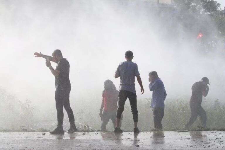 También se vio a los manifestantes arrojando sillas de plástico, piedras y otros artículos a la Policía, que disparó bombas de humo contra la multitud.