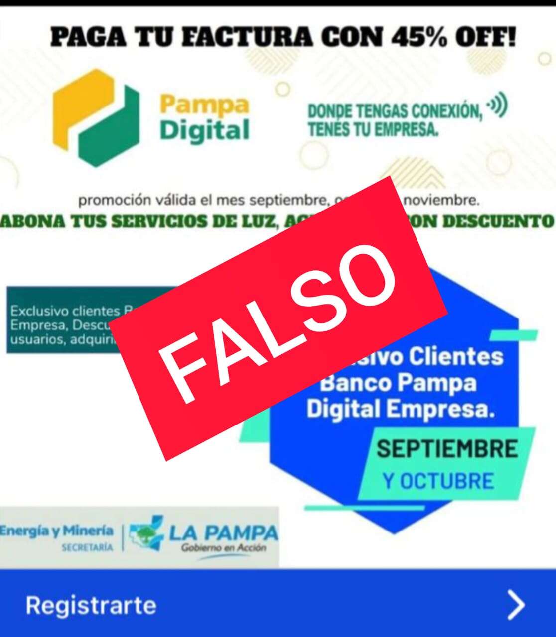 La Secretaría de Energía y Mineria informa y alerta a la sociedad sobre un posible fraude a través de una publicación que circula por las redes sociales que ofrece información FALSA respecto a que los clientes del Banco de La Pampa tendrán un 45% de descuento sobre el pago de la factura de luz y de gas.