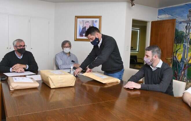 En el acto se hicieron presentes Matías Toso, secretario de Energía y Minería, Juan José Gorordo, viceintendente de la localidad, Cristian Javier Andres, administrador de APE, Luciano González, gerente técnico de APE, y los oferentes de las empresas que se presentaron a la licitación.