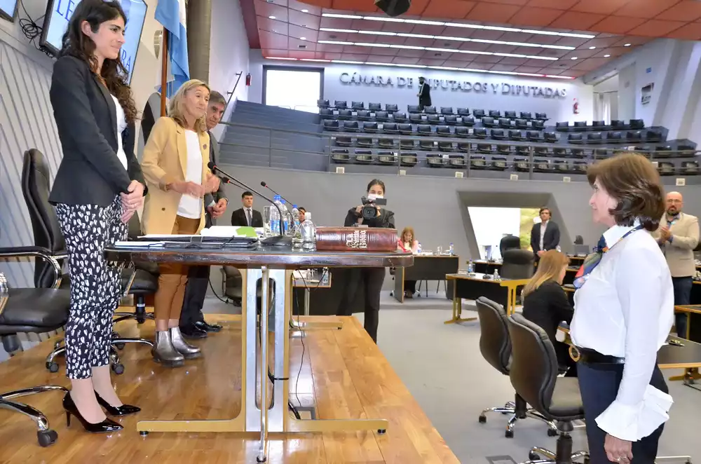 Adriana Dalmasso, juró “por la memoria” de su padre Oscar Dalmasso, ex intendente de Alvear y ministro de Gobierno durante el primer mandato de Rubén Marín, la diputada dentro del FreJuPa, corresponde a la línea de Convergencia Peronista.