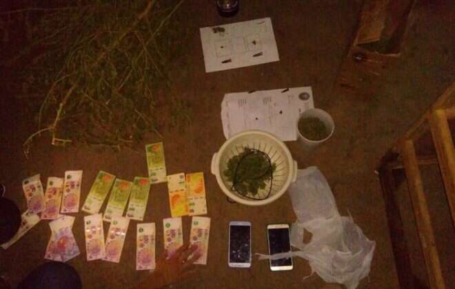 El primer accionar se realizó en el domicilio ubicado en calle 27 entre 102 y 104 del Barrio El Molino, en la cual reside una pareja mayor de edad. En este lugar se secuestraron 4 ramas en estado de secado la especie cannabis sativa; 95,6 gramos de flores de la misma especie, los que estaban fraccionados en distintos envoltorios para la venta; 2 teléfonos celulares; 3 plantas de cannabis sativa que oscilan en los 2 metros de altura; elementos de corte y manipulación de estupefacientes; y la suma de $5.000.