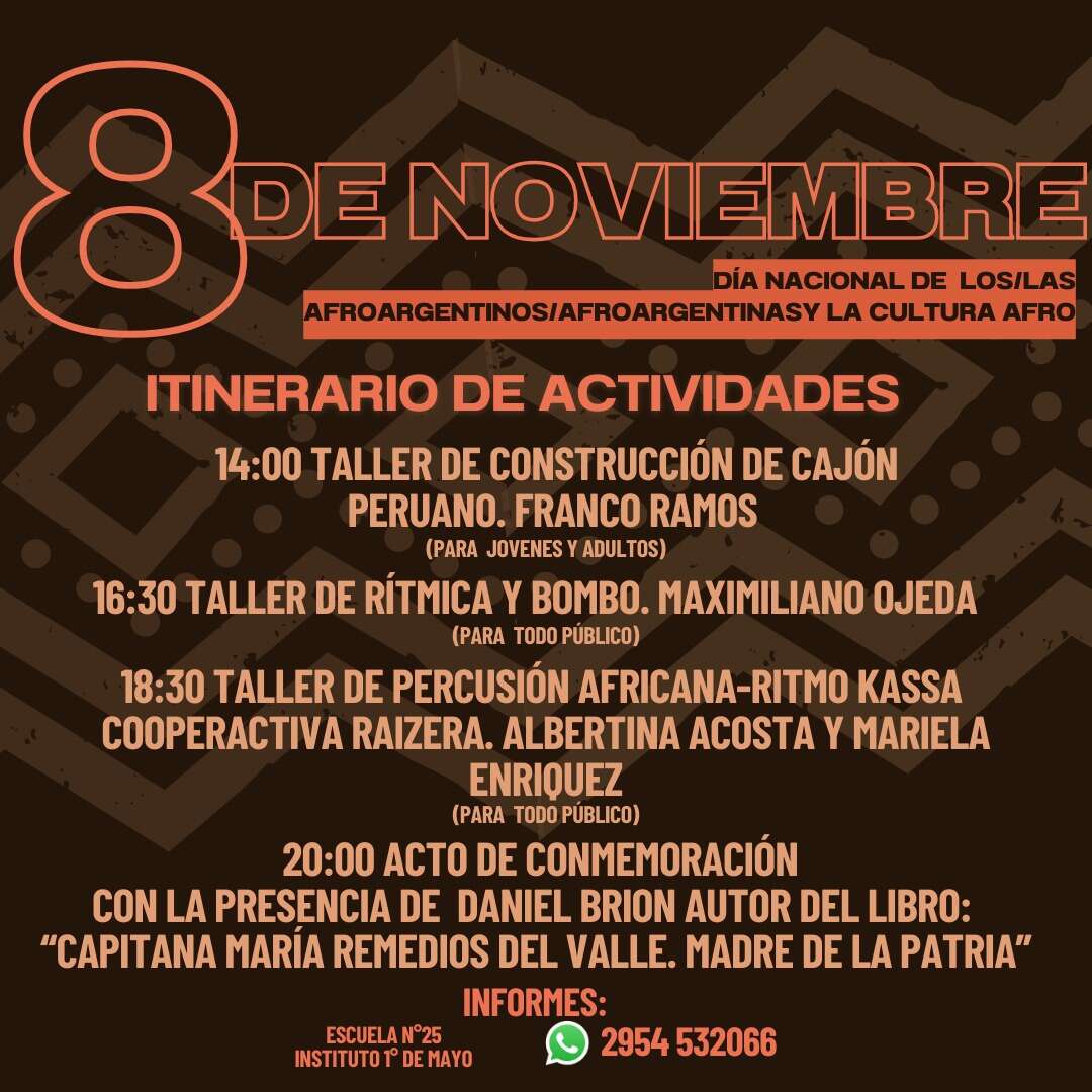 La jornada comenzará con tres talleres: a las 14 h construcción de cajón peruano; a las 16.30 h Rítmica y Bombo y las 18.30 h el último de Percusión Africana. Estos talleres serán gratuitos y abiertos a la comunidad en general. Para mayor información, las/os interesadas/os pueden comunicarse via WhatsApp al 2954-532066.