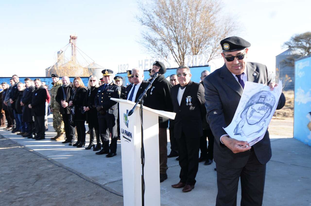 Seguidamente habló a los presentes Rolando Contreras, presidente del Centro de Veteranos de la provincia de La Pampa, quien luego recibió dibujos por parte de la estudiante local Maia Páez. También se dirigieron al público el jefe comunal y el subsecretario de Derechos Humanos. El intendente entregó una plaqueta tanto al Centro de Veteranos como al Gobierno de La Pampa y luego del retiro de las banderas de ceremonia se procedió con la entrega de medallas a veteranos, para culminar con un desfile militar.