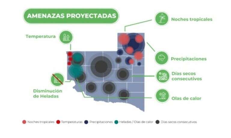 Riesgos Sociales y Económicos: Aumento de enfermedades asociadas al calor. Daños a infraestructuras y sistemas productivos, como la agricultura y la ganadería, claves para la economía provincial.