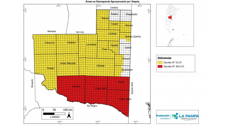 El documento, que lleva la firma del ministro de Economía, Luis Caputo, extiende la declaración de emergencia agropecuaria por sequía en la totalidad de los departamentos Capital, Chalileo, Chical Có, Caleu Caleu, Hucal, Lihuel Calel, Curacó, Loventué, Conhelo, Utracán, Toay, Limay Mahuida, Puelén, Maracó, Trenel y Rancul y parte de Atreucó, Guatraché y Quemú Quemú.