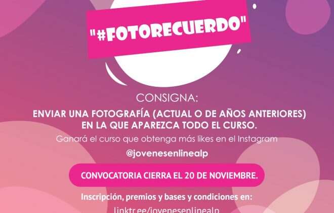 “Fotorecuerdo”: Deberán enviar una fotografía -actual o de años anteriores- en la que aparezcan todas y todos los estudiantes del curso, en lo posible dentro de la institución educativa. Premio: un mate, taza o jarro térmico con la fotografía sublimada para cada integrante del Curso.