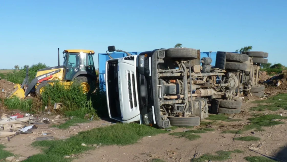 Según informó el medio Infotec, un camión Iveco Tector volcó sobre uno de sus laterales cuando el semi remolque con tierra y escombros intentaba descargar el en basurero.