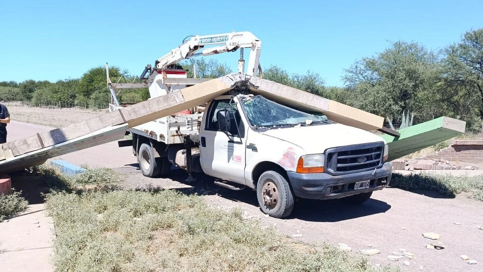 El operario conducía una camioneta con grúa y, al retirarse del lugar, derribó una arcada de cemento, lo que provocó importantes daños materiales y lesiones que motivaron su traslado al hospital, donde permanece internado en observación.