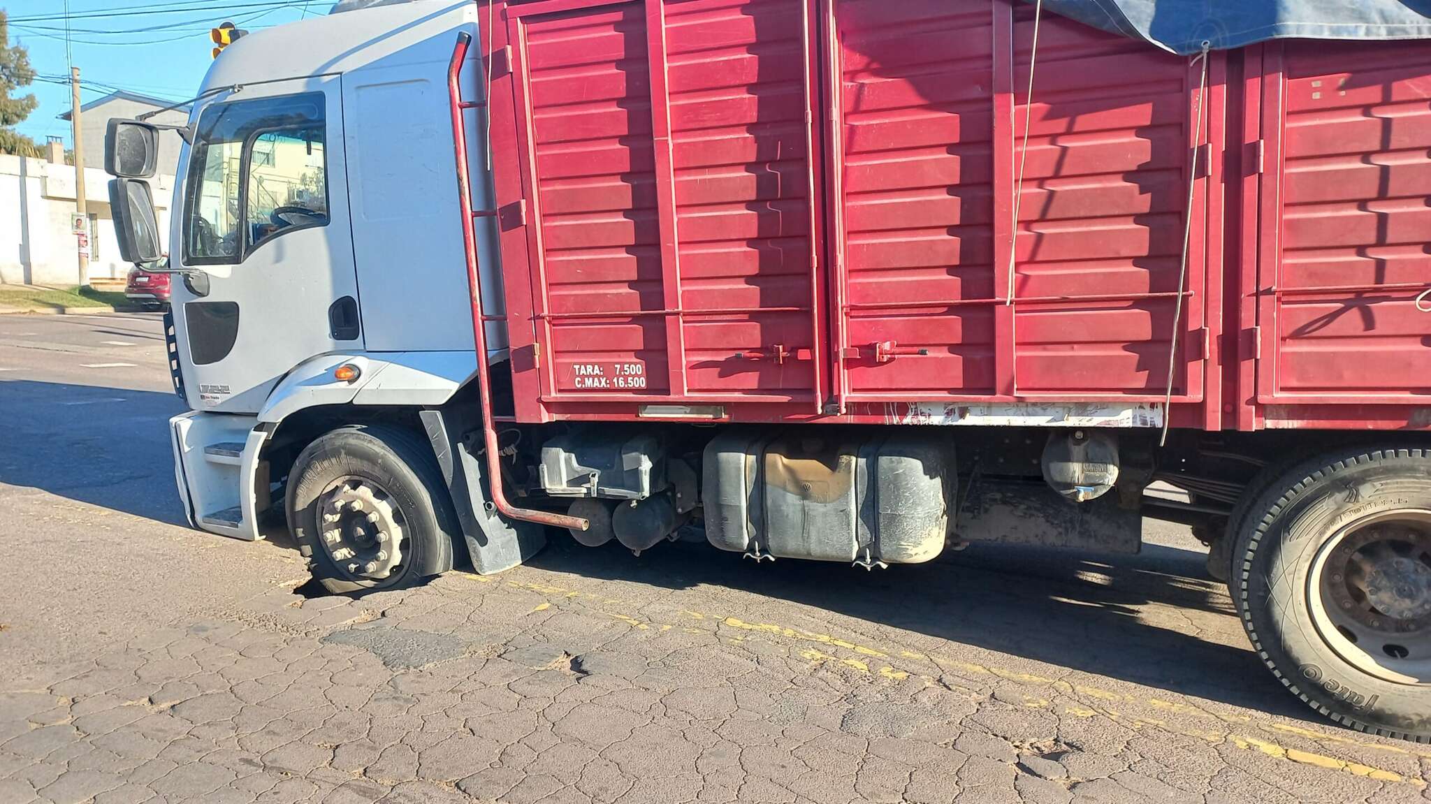 Este miércoles, en la intersección de las calles José Ingenieros y Ameghino, un camión quedó encajado, luego de que cediera el pavimento.