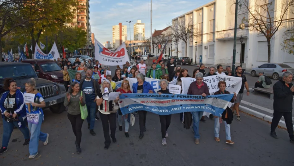 La marcha, convocada por la Coordinadora de Jubilados y Pensionados de La Pampa, comenzó a las 17.30 en Plaza San Martín y se desplazó hacia las sedes locales del PAMI y la ANSES, donde los manifestantes realizaron intervenciones con carteles y consignas.