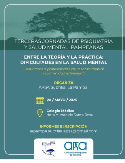 La Asociación de Psiquiatras de Argentina (APSA) Subfilial La Pampa, en conjunto con los colegios de Psicólogos y de Trabajadores Sociales, y un grupo independiente de Acompañantes Terapéuticos, organizará las 3° Jornadas Pampeanas de Psiquiatría y Salud Mental, bajo el lema: “Entre la teoría y la práctica: dificultades en la salud mental”.