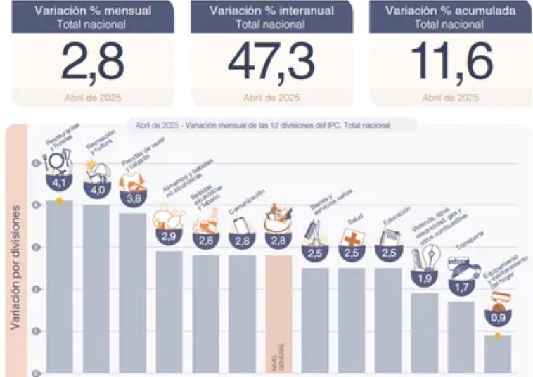 Las dos divisiones que registraron las menores variaciones en abril de 2025 fueron Transporte (1,7%) y Equipamiento y mantenimiento del hogar (0,9%).