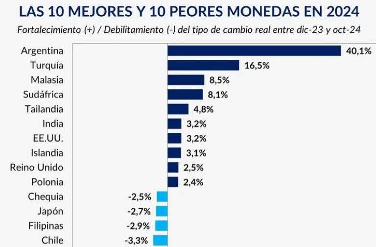 Abajo quedaron Turquía, que vio la lira apreciarse un 16,5%; Malasia en tercer lugar con 8,5%; y Sudáfrica en 8,1%; mientras que Brasil, principal socio comercial de Argentina, devaluó un 12,8% en los primeros 10 meses del año.