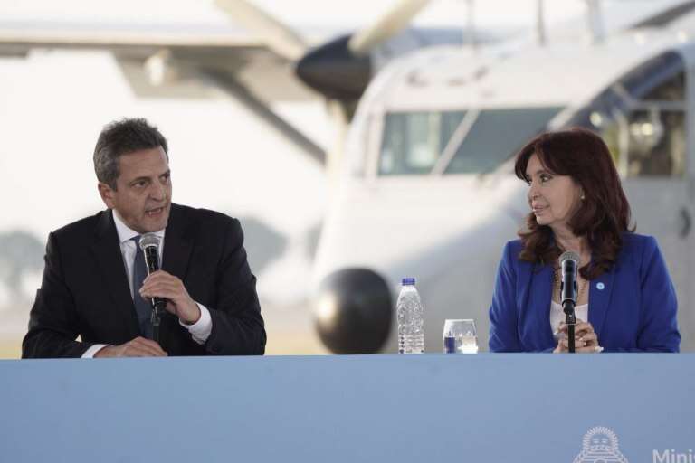 Cristina Kirchner y el flamante aspirante a Presidente de Unión por la Patria se mostraron por primera vez desde el anuncio de su postulación, en un acto conjunto por la recuperación del avión Skyvan PA-51, utilizado para los “vuelos de la muerte”, en la Aerostación Militar del Aeroparque Jorge Newbery.