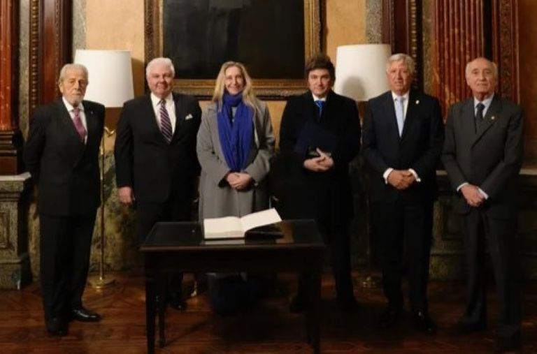 Javier y Karina Milei se trasladaron al mediodía a la sede de la institución, en la calle Alvear al 1.300 en el barrio de Retiro, luego de haber participado por la mañana en la AMIA del acto por el aniversario del atentado contra la mutual judía.